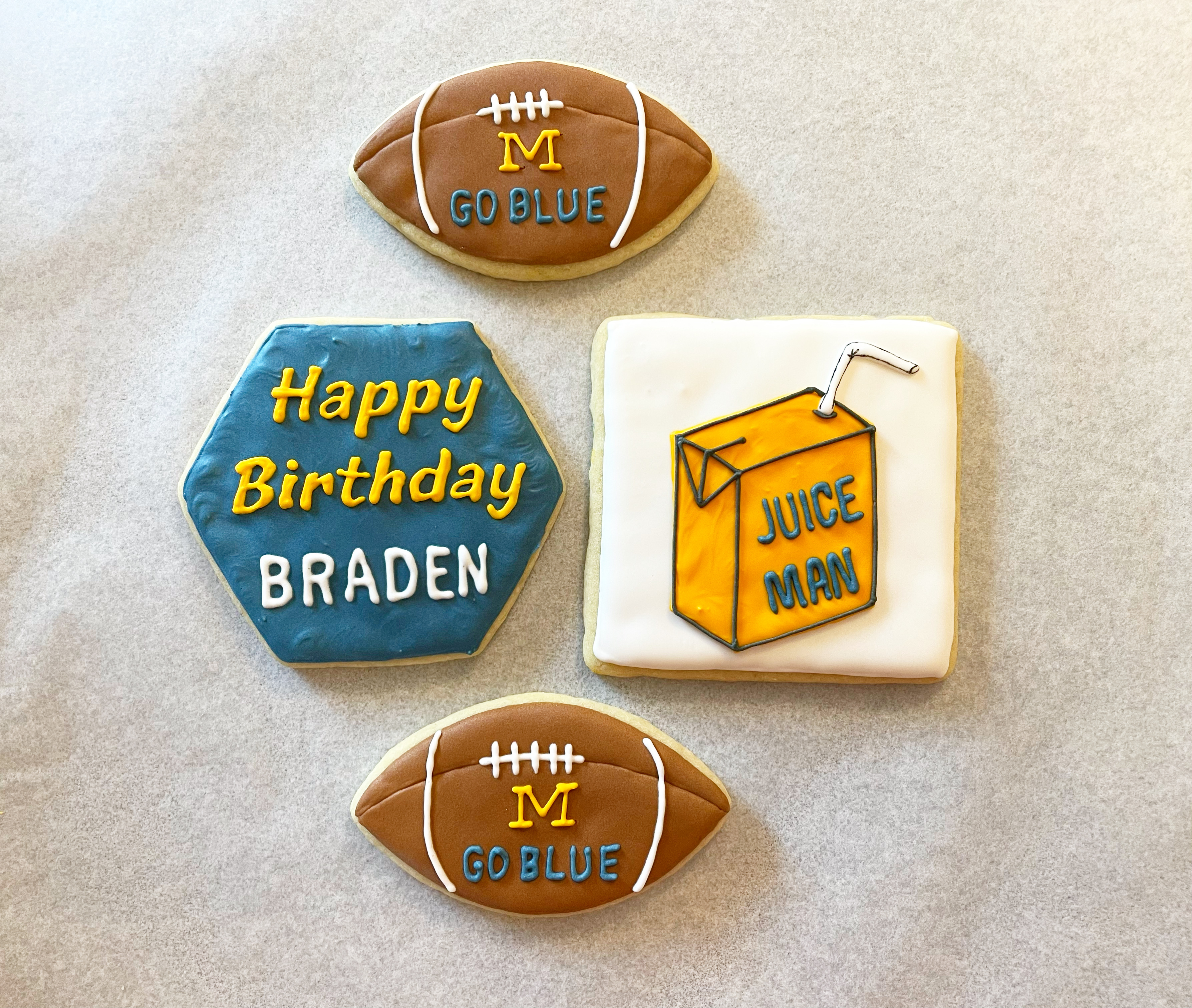Decorated sugar cookies start at $42/dozen for 3″ cookies. Contact me with your design ideas and I can send you a quote. Additional details and/or colors will increase the price.